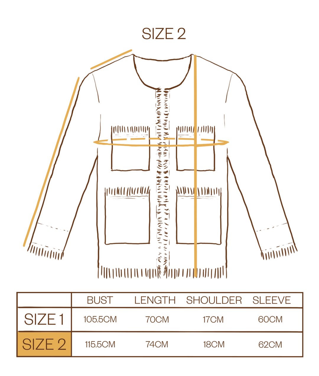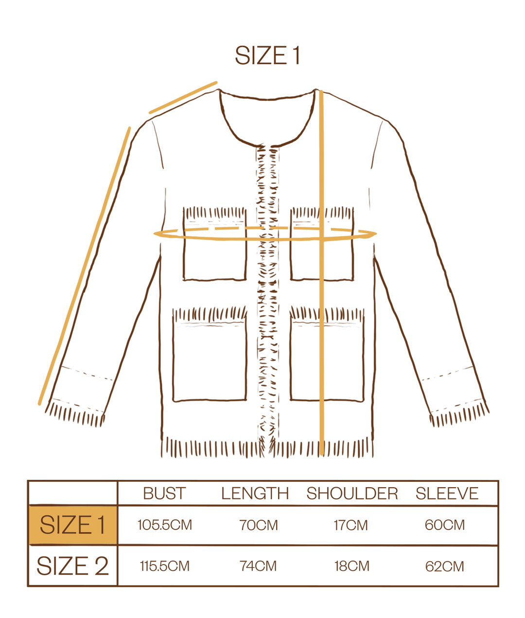 The Century Pocket Jacket is available in two sizes, named size 1 and size 2, to fit a range from AU6 to 16. To ensure you purchase the right size please use the size chart below. To get an accurate bust measurement, use a tape measure to measure around the widest part of your bust, keeping the tape measure straight and making sure it goes all the way around your chest.