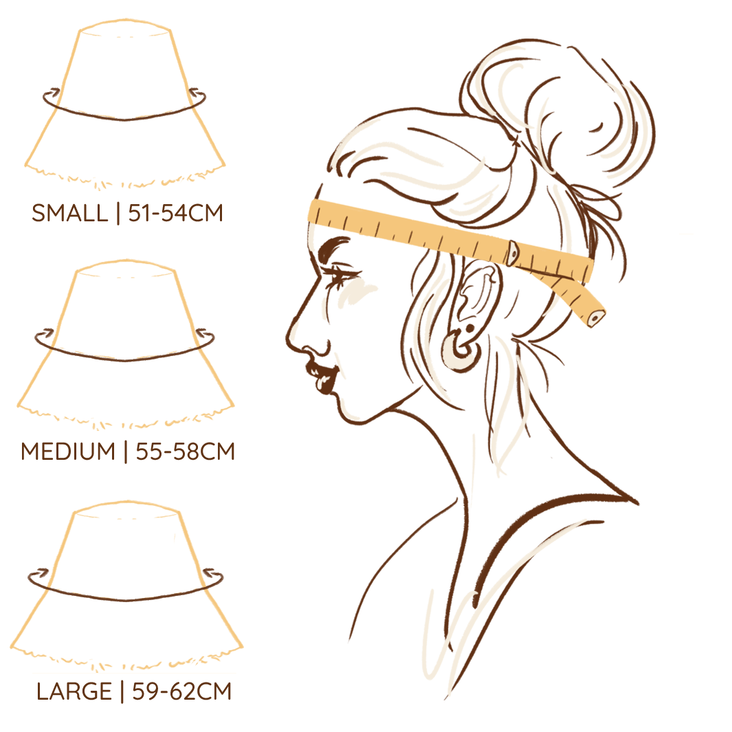 To discover which Re/lax Remade size is right for you, measure loosely around your crown where you want your hat to sit. This is usually at an angle (not horizontal) from your forehead to the largest part of the back of your head. If you are in between sizes, you can go either way depending on whether you'd like your hat to fit tighter and higher (smaller size), or looser and lower (larger size).