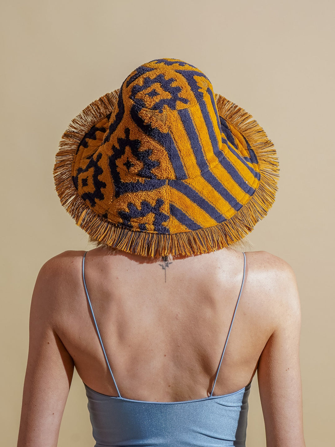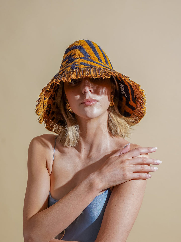 Constructed lovingly and respectfully by Re/lax Remade artisans from two rare vintage luxury towels, this hat features impeccable pattern placement and meticulous craftsmanship, showcasing the iconic YSL stripes in a regal ink and gold colour way. The YSL logo has been placed in a way that allows it to be visible when the Re/lax Remade logo is worn at the front.