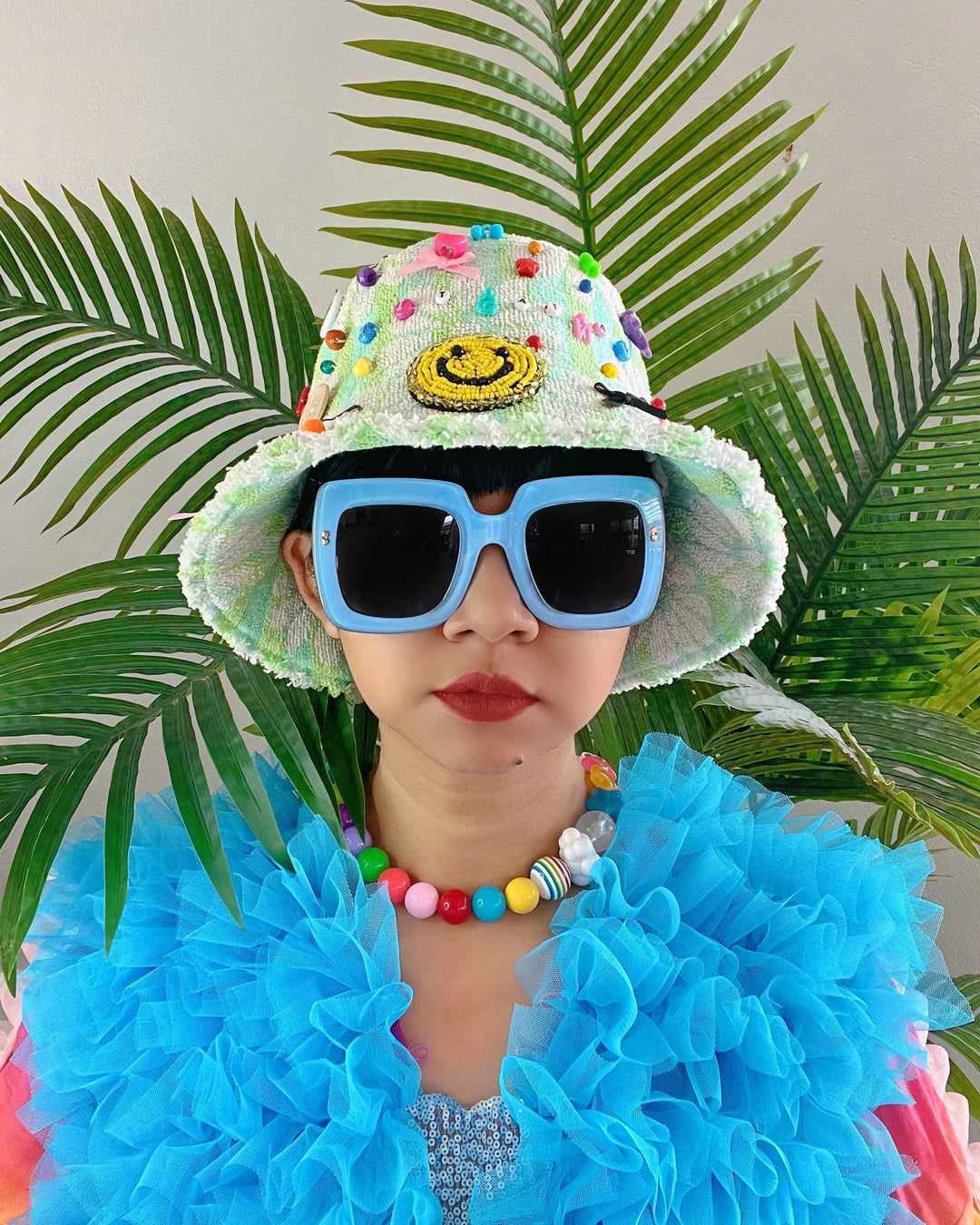Diana is an upcycling trailblazer, author, fashion designer and all round legend. We decided that our new Rescue hats - which take otherwise age worn towels and resuscitate them into nostalgic bucket hats - were a perfect blank canvas for her colourful, dopamine-dripping world view.