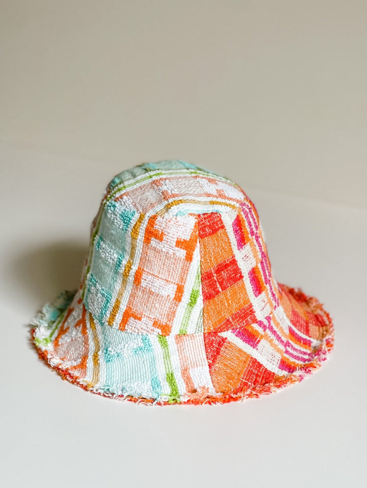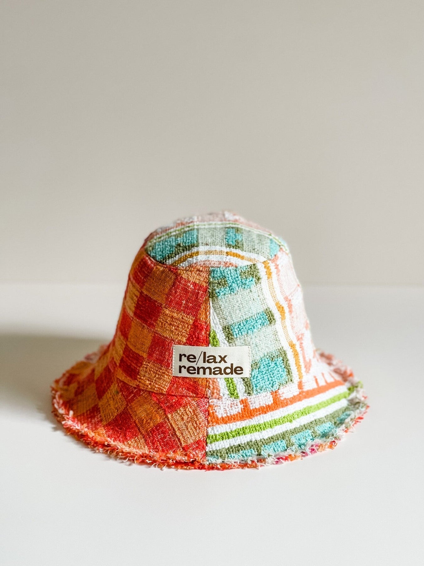 A lovingly patchworked hat made from pieces of two beautiful vintage towels featuring unique woven detailing.