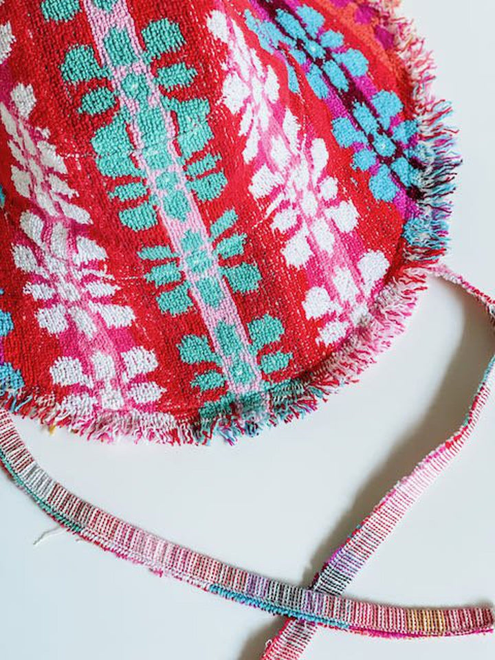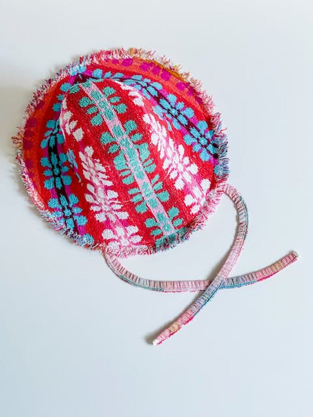 A bright fiesta of a hat, lovingly handmade from a vibrant, lively vintage towel found in excellent condition. I’m really excited about the pattern placement on this one.