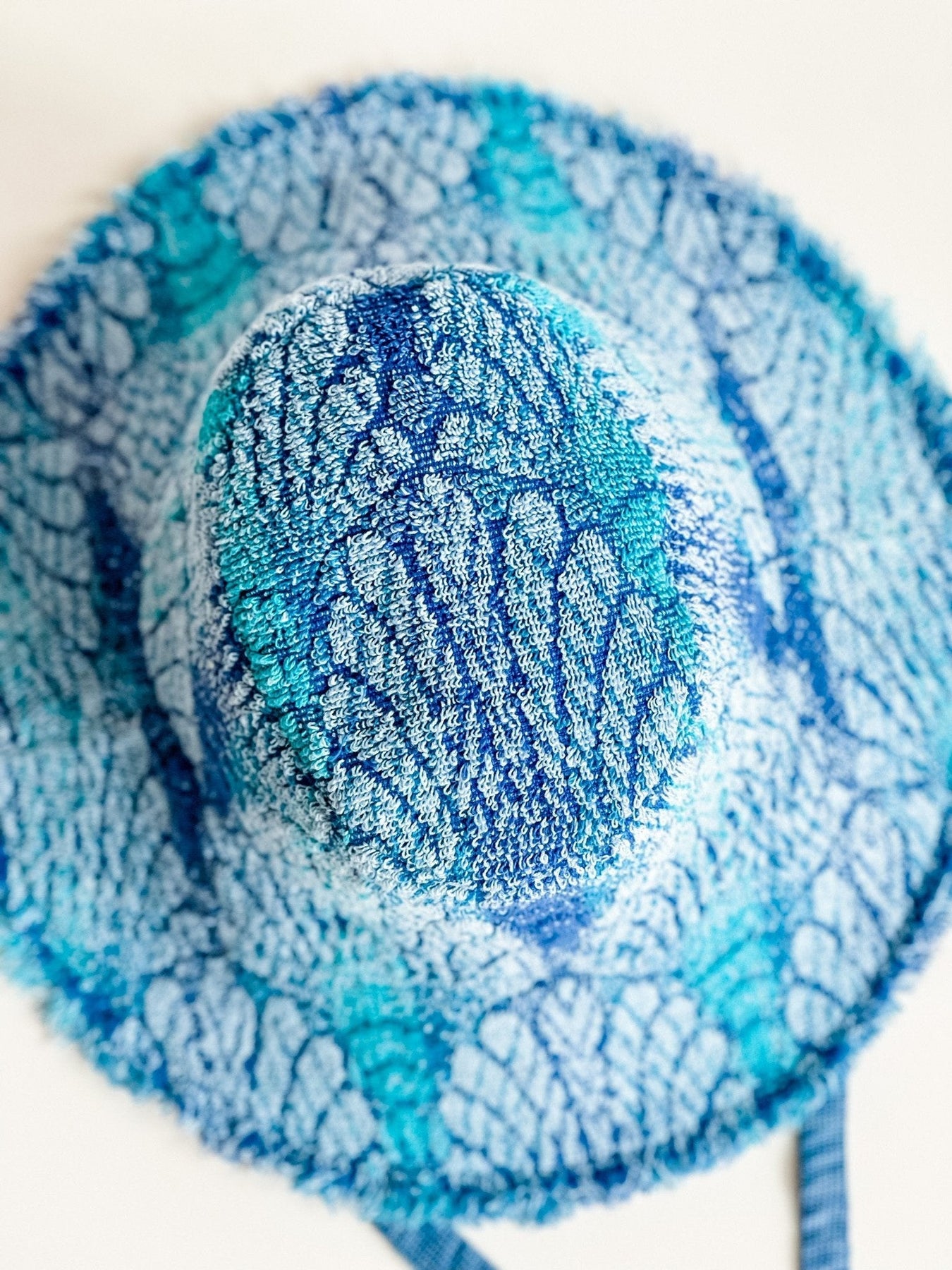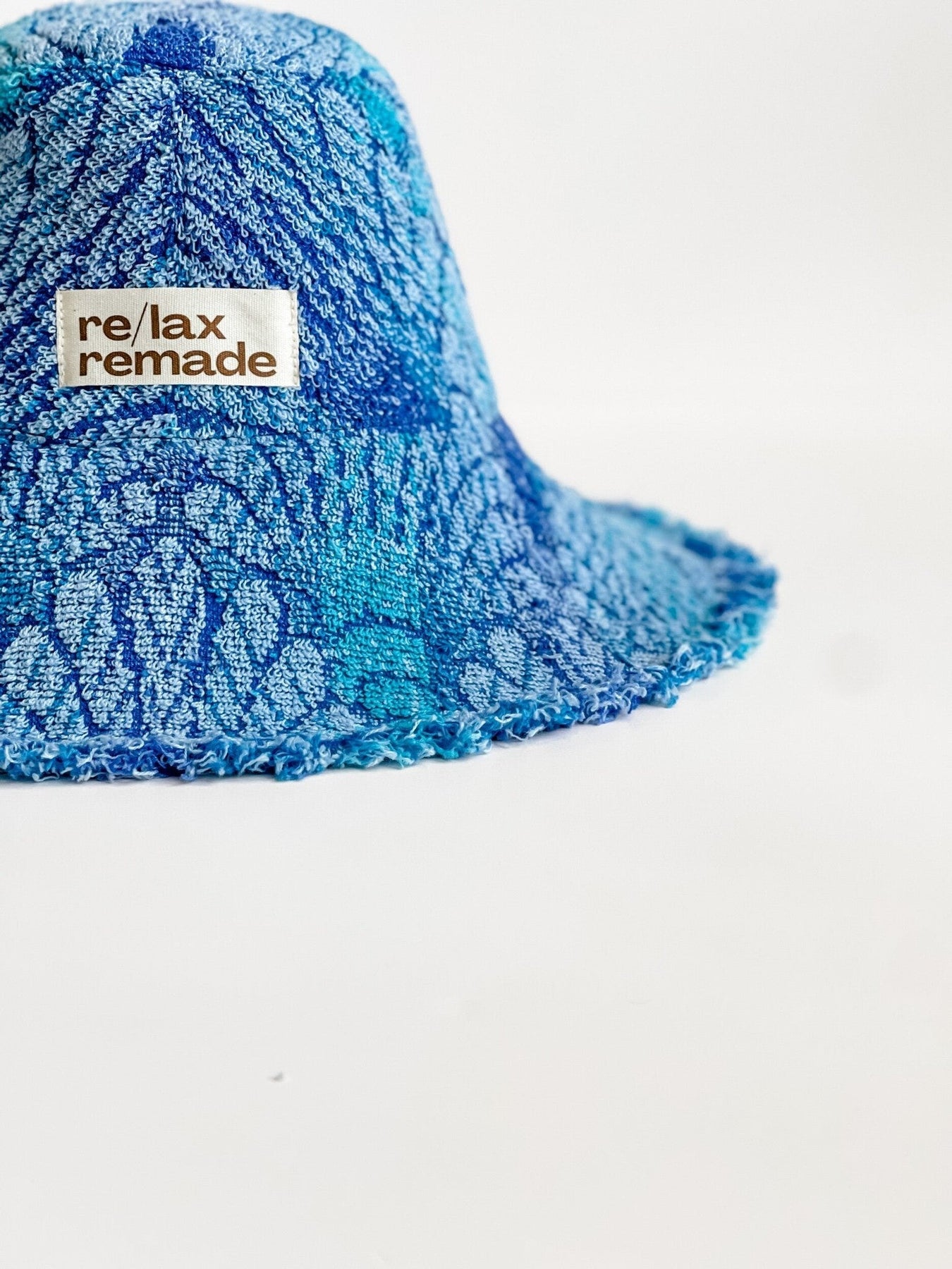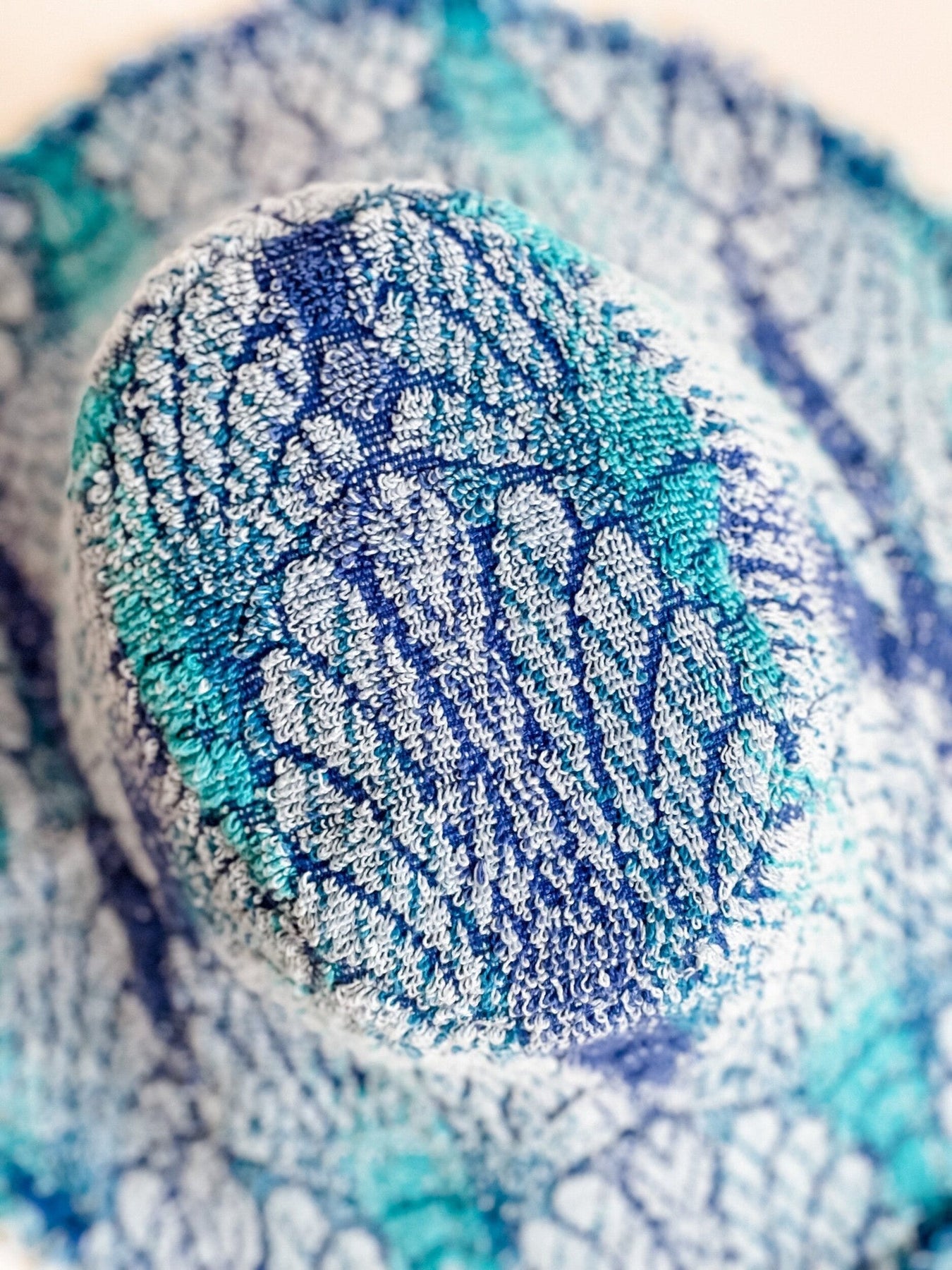 A meticulously handmade hat created from a uniquely textured vintage towel found in excellent condition.