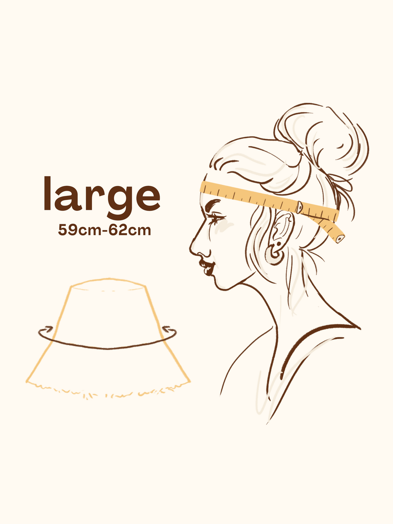 Fits size L: 59-62cm. Please measure your head before purchasing to avoid disappointment. We suggest measuring at an angle from your forehead to the largest part of the back of your head. Please note that as each towel is unique - some thicker, some thinner, some denser, some fluffier - the exact measurements will differ slightly, and each hat will fit and feel unique. In general, the patchwork hats will fit slightly firmer than the single towel hats, because of the extra seams.